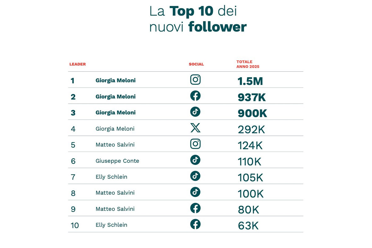 Meloni detiene inoltre il primato assoluto nella crescita dei follower, circa 3,6 milioni di nuovi iscritti complessivi sulle quattro principali piattaforme. A trainare l’incremento è soprattutto Instagram, che registra oltre 1,5 milioni di nuovi follower. La sua audience potenziale raggiunge così 19 milioni di utenti, con le performance migliori concentrate su TikTok e Instagram, piattaforme centrali per intercettare i segmenti più giovani dell’elettorato.