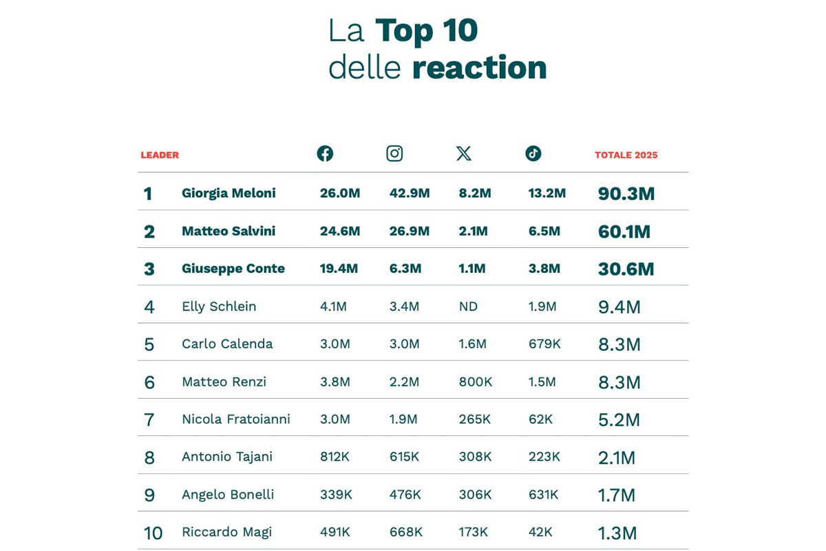 In questo contesto, la leadership digitale di Giorgia Meloni si conferma centrale anche nel 2025, terzo anno alla guida del governo. I suoi account social crescono più rapidamente rispetto a quelli degli altri leader e, per la prima volta dal 2022, le interazioni complessive superano quelle di Matteo Salvini, che fino a quel momento aveva dominato la classifica delle reaction. Una dinamica che combina crescita dei follower e capacità di coinvolgimento, assumendo particolare rilievo in vista del traguardo elettorale del 2027.