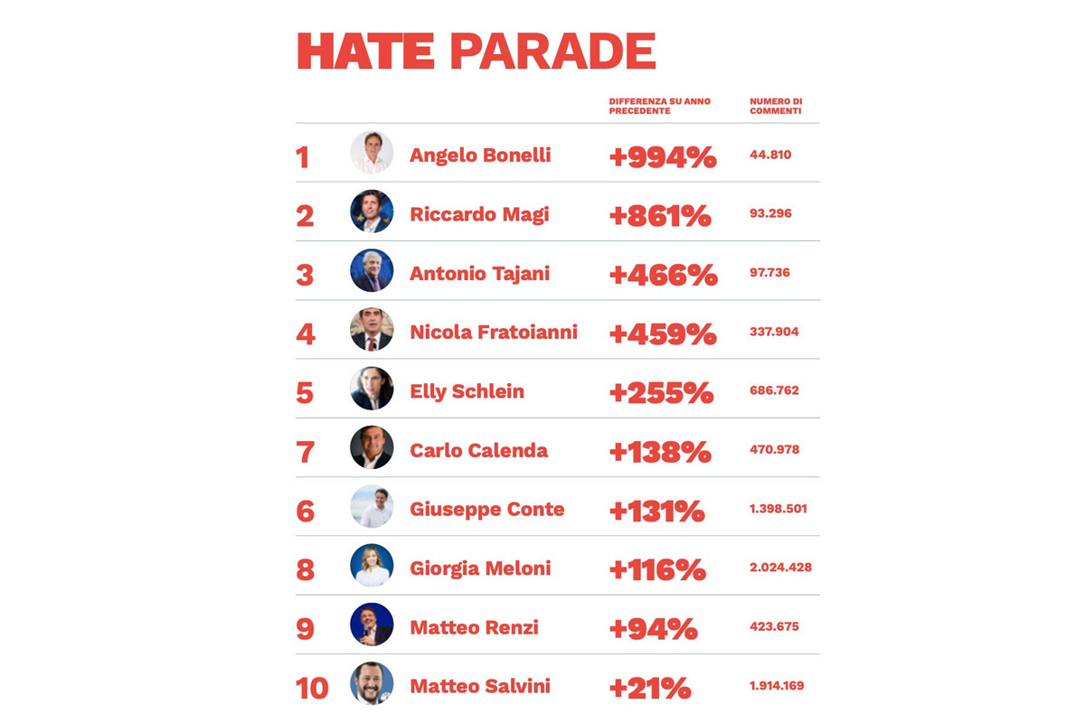 Accanto alla crescita dell’audience, emerge anche una maggiore polarizzazione del dibattito online. La Hate Parade segnala infatti l’incremento più consistente di commenti negativi sulle pagine di Angelo Bonelli, Riccardo Magi e Antonio Tajani.