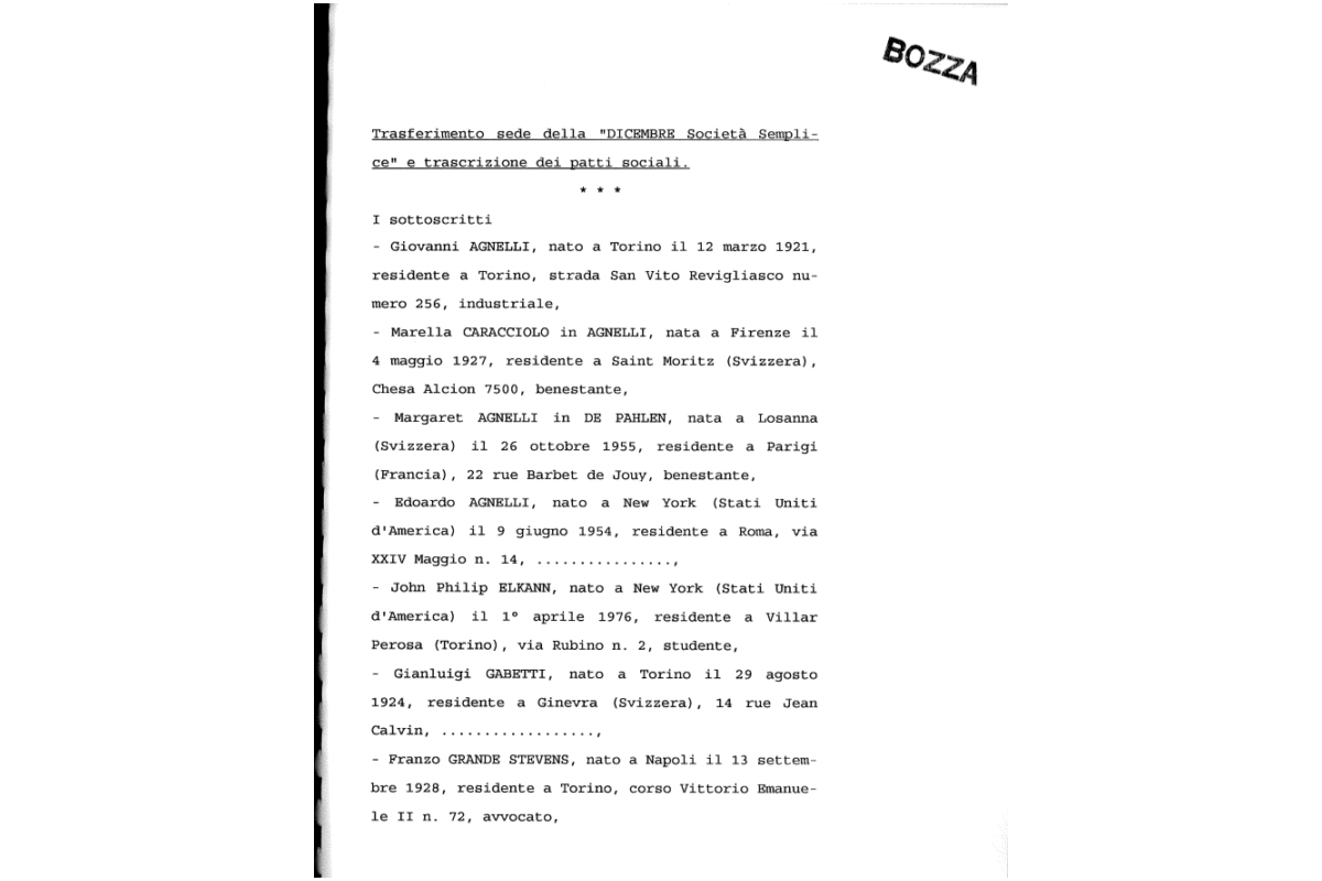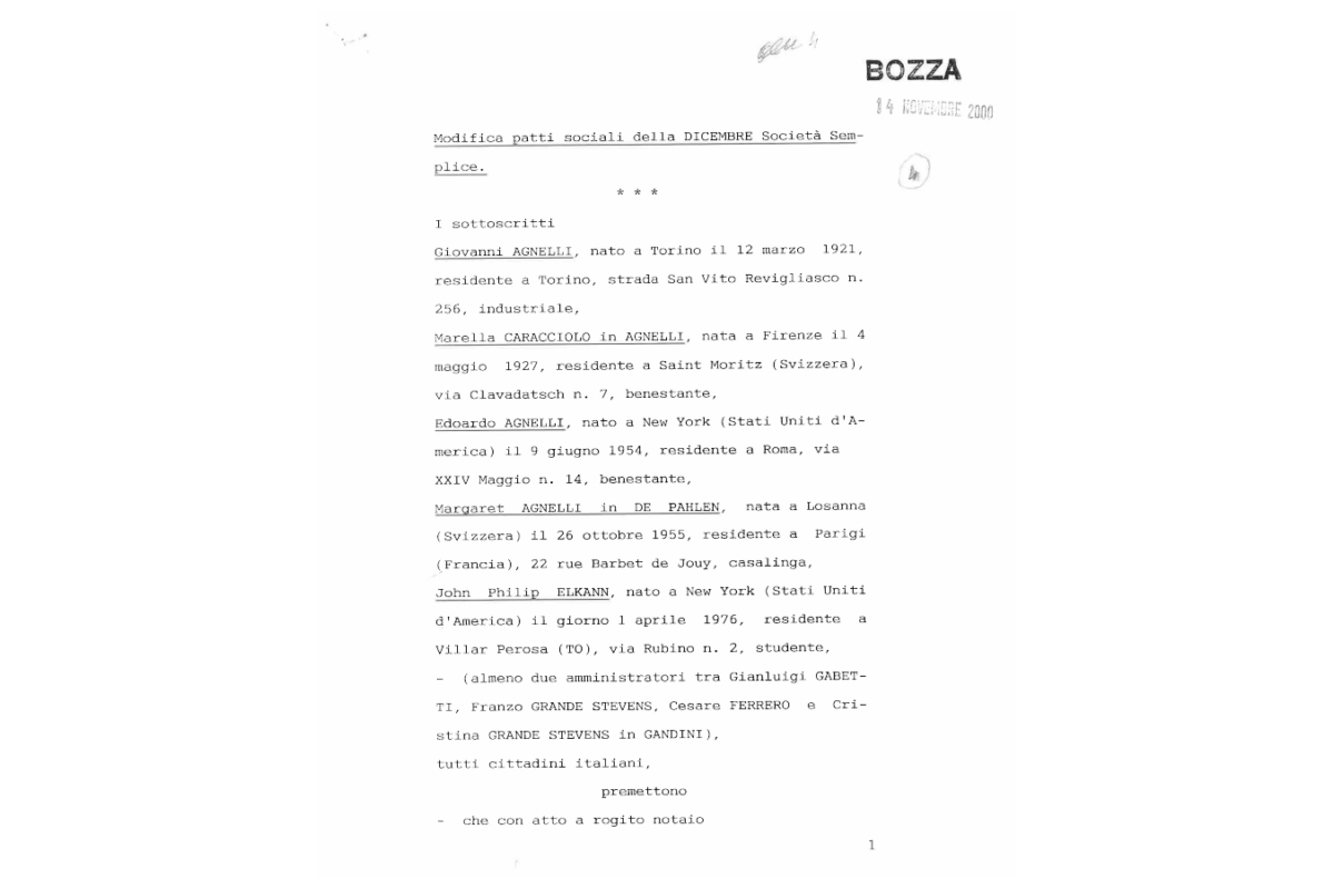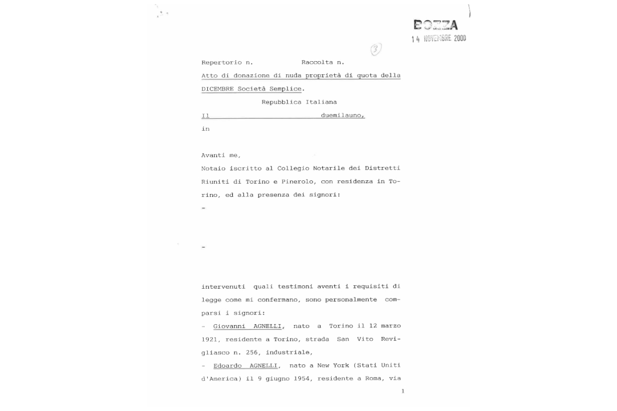 A riportarla è il Fatto Quotidiano. Nelle ultime righe della seconda pagina si legge: “Il signor Giovanni Agnelli dona al signor Edoardo Agnelli, che accetta, la nuda proprietà… riservandosi l’usufrutto generale vitalizio di una quota di lire 5 miliardi della Dicembre Società semplice, con sede in Torino”. In pratica, Gianni Agnelli stava predisponendo un passaggio di quote della Dicembre, la cassaforte di famiglia che controlla il cuore finanziario dell’impero Agnelli-Elkann, attraverso la Giovanni Agnelli B.V. e Exor.