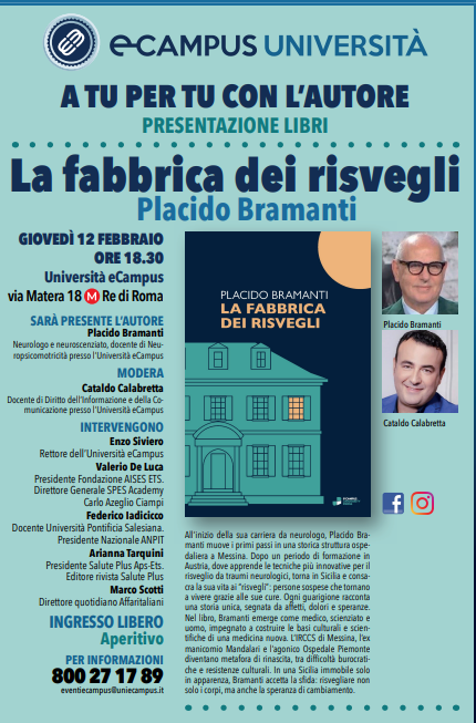 Giovedì 12 febbraio alle ore 18.30 l’Università eCampus di Roma ospiterà un incontro con Placido Bramanti, autore del libro La fabbrica dei risvegli, neurologo e neuroscienziato di fama internazionale, nonché docente di Neuropsicomotricità presso l’Università eCampus e responsabile della pagina “Salute” di Affaritaliani.it.