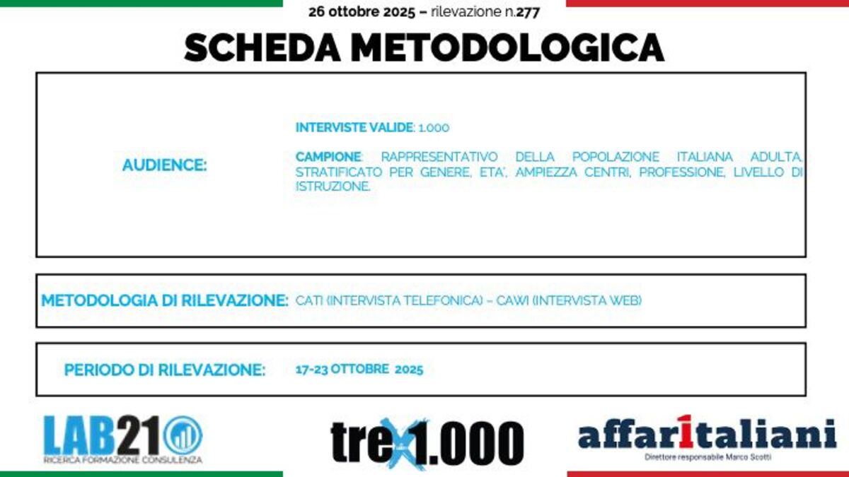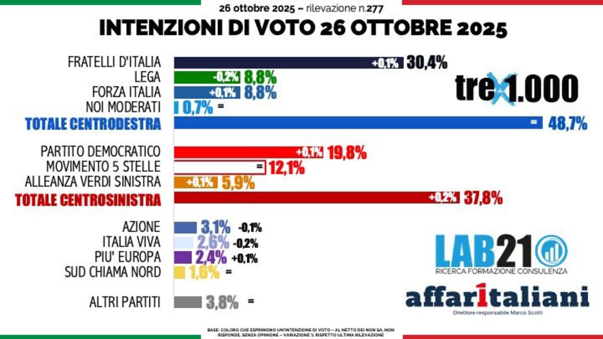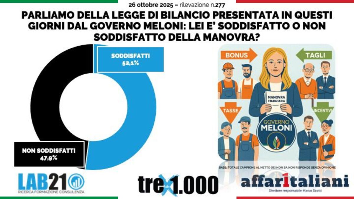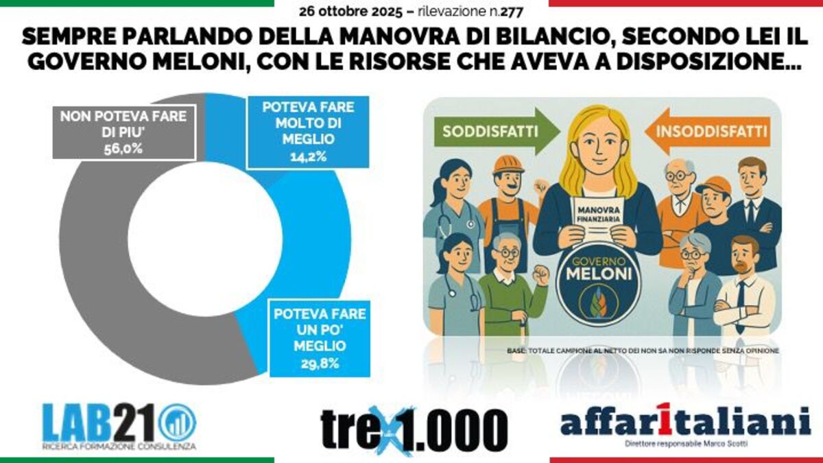 Passando alla Legge di Bilancio per il prossimo anno, secondo il 56% degli italiani il governo con le risorse che aveva a disposizione non poteva fare di più. Non solo, il 52,1% degli intervistati si ritiene soddisfatto della manovra economica per il 2026. Tra i partiti, nelle intenzioni di voto, Fratelli d’Italia si conferma ampiamente sopra quota 30% mentre Forza Italia raggiunge la Lega. Pd sotto il 20% e M5S stabile.