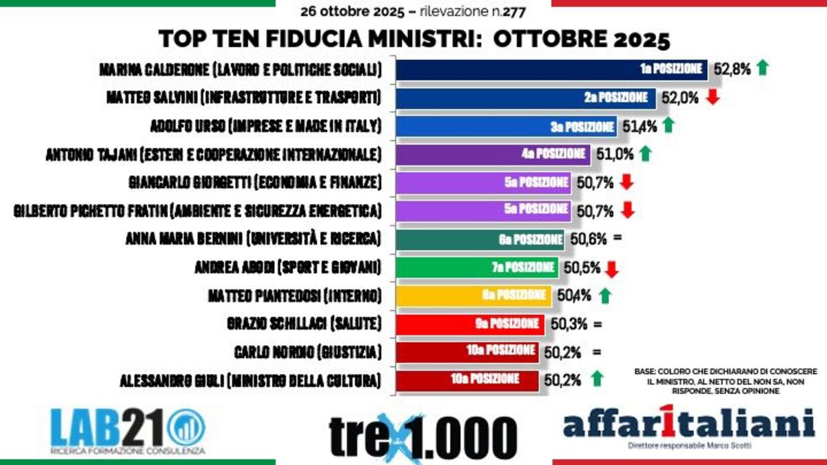 La ministra del Lavoro e delle Politiche Sociali Marina Calderone si conferma prima in classifica come fiducia tra gli italiani nei membri del governo guidato da Giorgia Meloni. Secondo il sondaggio realizzato per Affaritaliani da Roberto Baldassari, direttore generale dell’istituto demoscopico Lab21, Calderone a ottobre 2025 risulta in crescita come gradimento con una percentuale pari al 52,8%. In seconda posizione Matteo Salvini, terzo Adolfo Urso.
