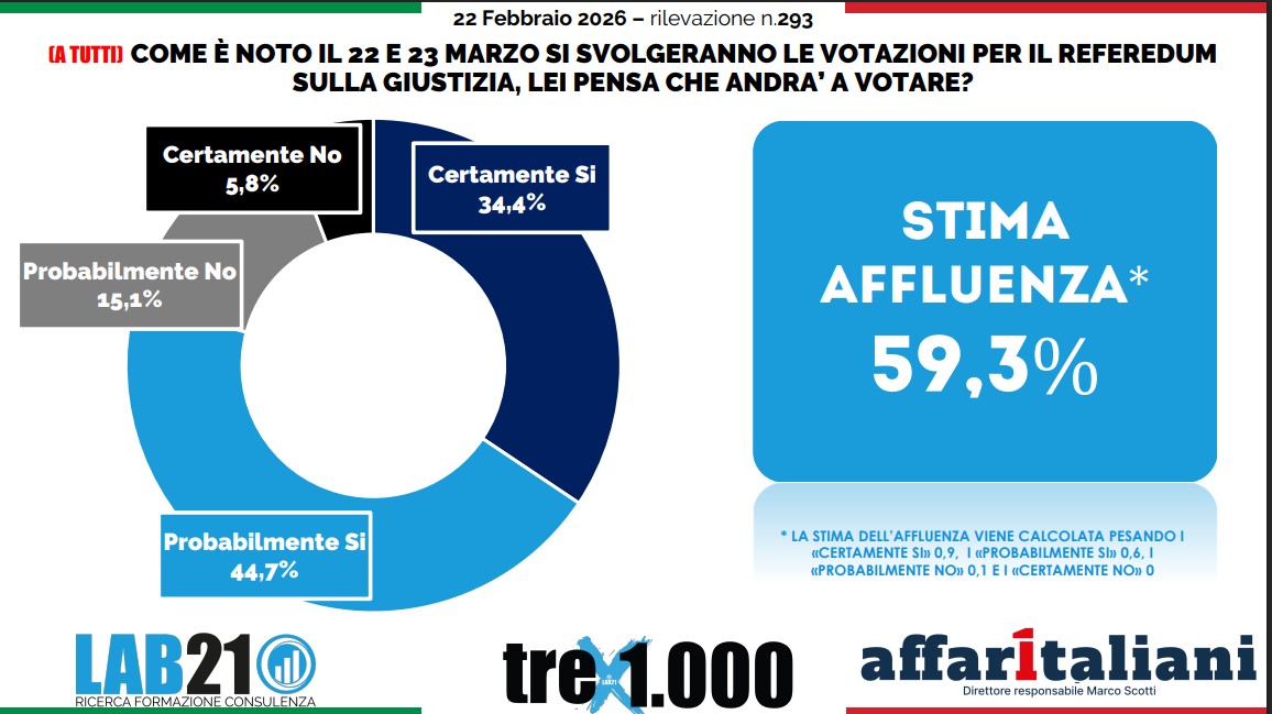 Vittoria netta per la presidente del Consiglio Giorgia Meloni e tutto il Centrodestra. Secondo i dati del sondaggio realizzato per Affaritaliani da Roberto Baldassari, direttore generale dell’istituto demoscopico Lab21, al referendum confermativo sulla riforma costituzionale della giustizia in programma il prossimo 22 e 23 marzo il SI’ vincerà nettamente con il 63,2%. Contro la riforma del Centrodestra – posizione sostenuta da Pd, M5S, AVS e ANM – solo il 36,8% del campione delle persone intervistate. Un dato sostanzialmente stabile rispetto alla rilevazione di metà gennaio (+0,4% per il Sì), che consolida il vantaggio dei sostenitori della riforma.